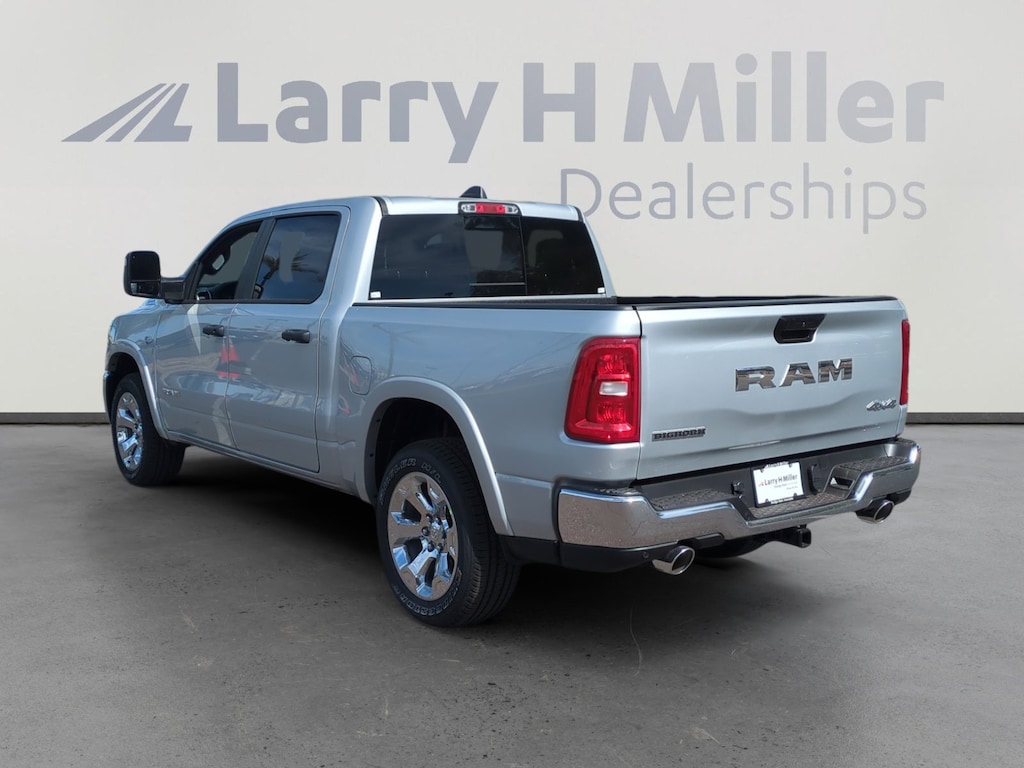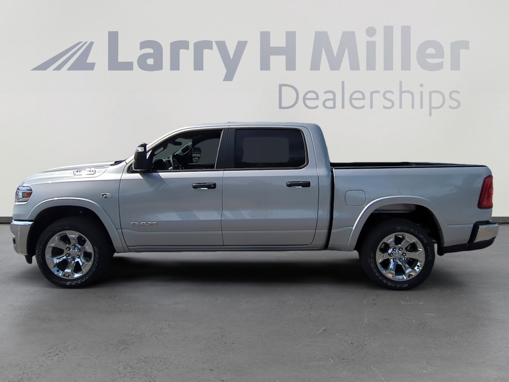 Silver Zynith 2026 Ram 1500 Big Horn/Lone Star 4WD 8-Speed Automatic HEMI 5.7L V8 Multi Displacement VVT eTorque 115V Auxiliary Power Outlet, 115V Auxiliary Rear Power Outlet, 12-Way/1-Way Trailer Connector, 12 Touchscreen Display, 2nd Row in Floor Storage Bins, 3 Rear Seat Head Restraints, 4 Way Front Headrests, 4-Wheel Disc Brakes, 400W Inverter, 48V Belt Starter Generator, 4G LTE Wi-Fi Hot Spot, 6 Speakers, 9 Amplified Speakers with Subwoofer, ABS brakes, Accent Color Tailgate Handle, Air Conditioning, Air Conditioning ATC with Dual Zone Control, Alloy wheels, AM/FM radio, Anti-Spin Differential Rear Axle, Apple CarPlay, Apple CarPlay/Android Auto, Auto High-beam Headlights, Auto Power-Folding Mirrors, Auto-Dimming Exterior Driver Mirror, Auto-Dimming Rear-View Mirror, Big Horn Level 2 Equipment Group, Black Exterior Mirrors, Black Premium Power Mirrors, Black Trailer Tow Power Mirrors, Body Color Fender Flares, Brake assist, Bucket Seats, Bumpers: chrome, Center Console Parts Module, Cloth Bucket Seats, Cluster 7.0 TFT Color Display, Compass, Configurable Drive Mode, Connected Travel and Traffic Services, Connectivity - US/Canada, Convex Wide-Angle Exterior Mirror Insert, Delay-off headlights, Deluxe Cloth Bucket Seats, Disassociated Touchscreen Display, Driver door bin, Dual front impact airbags, Dual front side impact airbags, Electronic Stability Control, Exterior Mirrors Courtesy Lamps, Exterior Mirrors with Heating Element, Exterior Mirrors with Supplemental Signals, Front anti-roll bar, Front Bucket Seats, Front Center Armrest w/Storage, Front fog lights, Front reading lights, Front Seat Back Map Pockets, Front wheel independent suspension, Full Length Floor Console, Fully automatic headlights, Global Telematics Box Module, Glove Box Lamp, Google Android Auto, GPS Antenna Input, GPS Navigation, HD Radio, Heated door mirrors, Heated Front Seats, Heated Steering Wheel, Illuminated entry, Integrated Center Stack Radio, Integrated Voice Command with Bluetooth, Leather Wrapped Steering Wheel, LED Dome Lamp with on/Off Switch, LED Footwell Lighting, Low tire pressure warning, Manual Adjust 4-Way Driver Seat, Manual Adjust 4-Way Front Passenger Seat, Manual Folding Exterior Mirrors, Manual Telescoping Mirrors, Manufacturer's Statement of Origin, Media Hub with 2 Charge Only USBs, Mirror Clearance/Running Lights, MOPAR Front and Rear Rubber Floor Mats, Occupant sensing airbag, Outside temperature display, Overhead airbag, Overhead console, Overhead LED Lamps, Panic alarm, ParkView Rear Back-Up Camera, Passenger door bin, Passenger vanity mirror, Power 2-Way Driver Lumbar Adjust, Power Adjust 8-Way Driver Seat, Power Adjustable Pedals, Power door mirrors, Power steering, Power windows, Power-Adjustable Convex Aux Mirrors, Premium Overhead Console, Quick Order Package 27Z Big Horn, Radio data system, Radio: Uconnect 5 Navigation with 12.0 Display, Radio: Uconnect 5 W with 8.4 Display, RAM Grille Badge - Chrome, Rear 60/40 Folding Seat, Rear anti-roll bar, Rear Center Armrest, Rear Power Sliding Window, Rear step bumper, Rear Window Defroster, Remote keyless entry, Remote Tailgate Release, Security Alarm, SiriusXM Radio Service, SiriusXM with 360L, Speed control, Steering Wheel Mounted Audio Controls, Sun Visors with Illuminated Vanity Mirrors, Supplier Part Tracking (J-1), Surround View Camera System, Tachometer, Telescoping steering wheel, Tilt steering wheel, Towing Technology Group, Traction control, Trailer Brake Control, Trailer Hitch Line-Up Assist, Trailer Reverse Steering Control, Trailer Tire Pressure Monitoring System, Trailer Tow Group, Trailer Tow Mirrors, Trip computer, Universal Garage Door Opener, USB Host Flip, Variably intermittent wipers, Voltmeter.