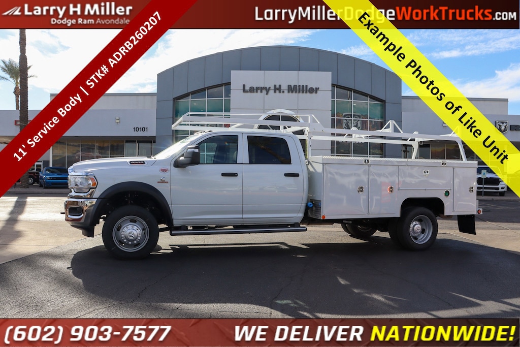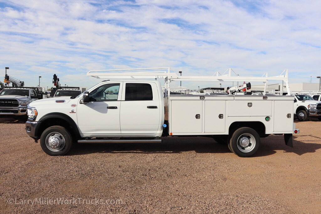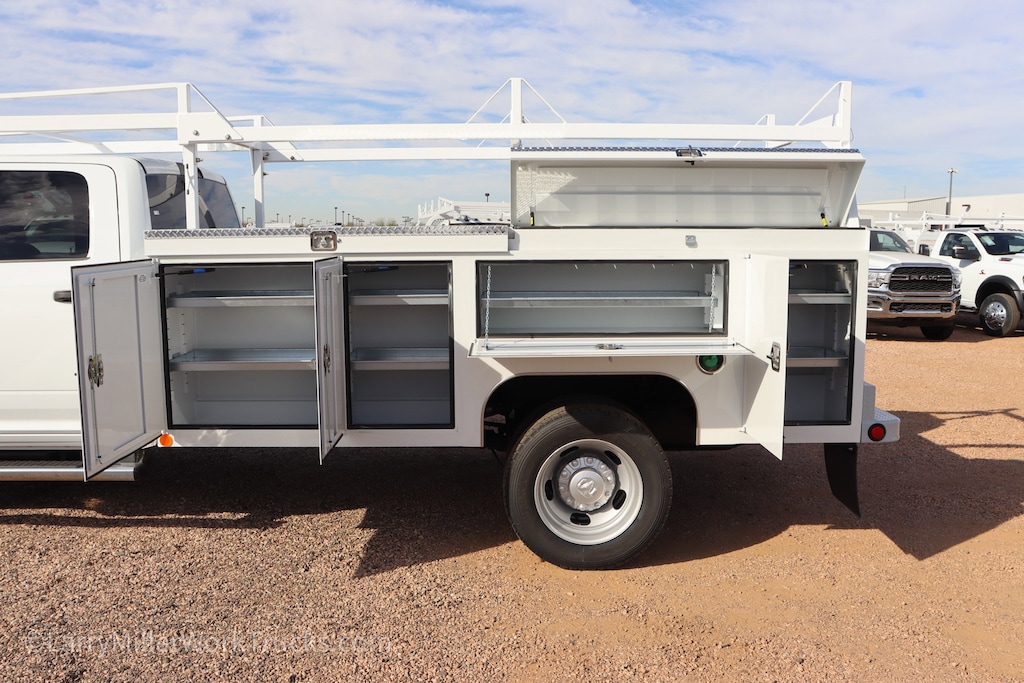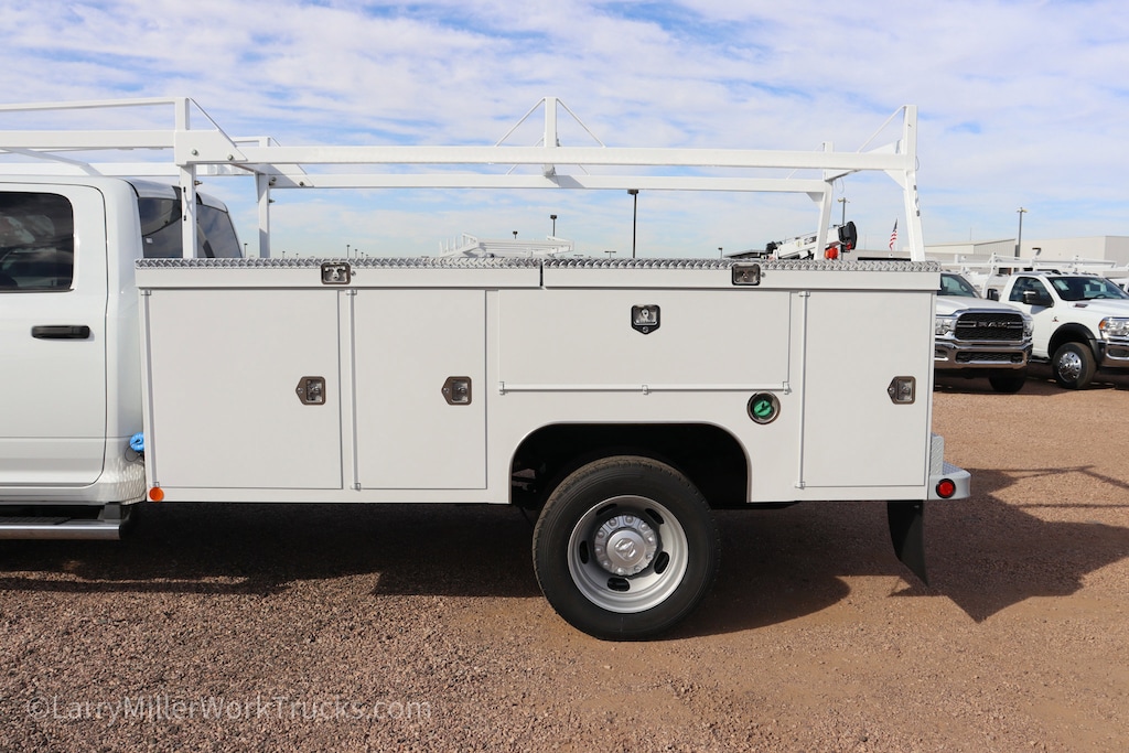 New 2026 Ram 4500 Crew Cab 4x4 Diesel with an 11' Scelzi Service Body work truck for sale. The sale price includes the utility truck body and the ladder rack. Stock# ADRB260207.